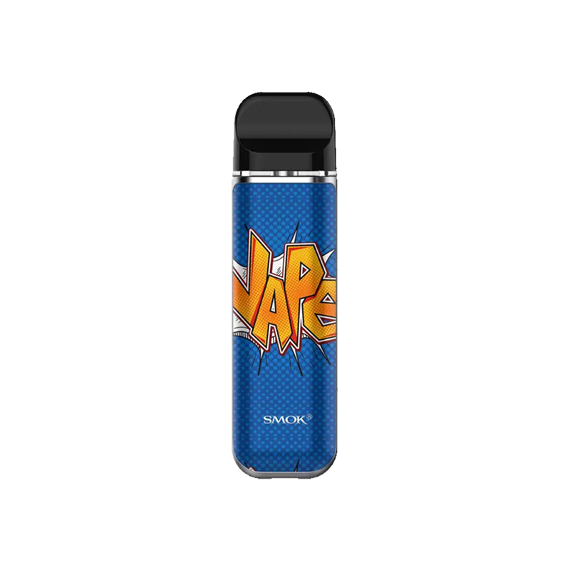 POD SMOK Novo 2 oklejony ozdobną naklejką z napisem "Vape". Najważniejsze informacje: