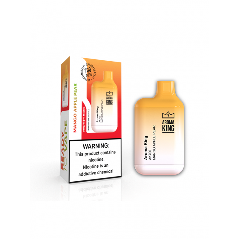 Jednorazowy e-papieros marki Aroma King, wypełniony liquidem w postaci soli nikotynowej o smaku mango z jabłkiem i gruszką. Moc: 20mg/ml. Ilość zaciągnięć: 700.