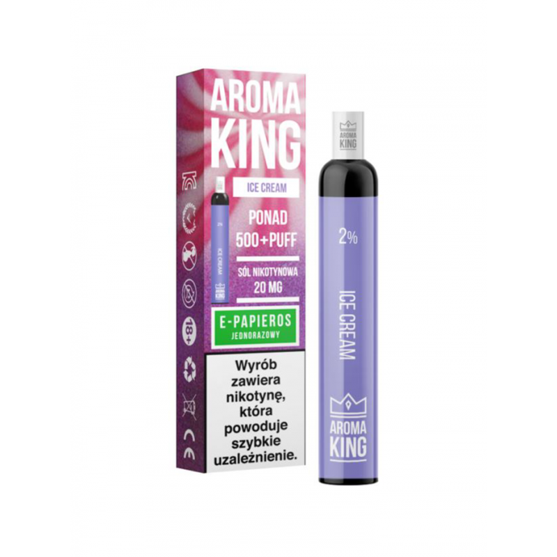 Jednorazowy e-papieros napełniony liquidem w postaci soli nikotynowej o smaku lodów. Moc: 20mg/ml. Ilość zaciągnięć: 500.