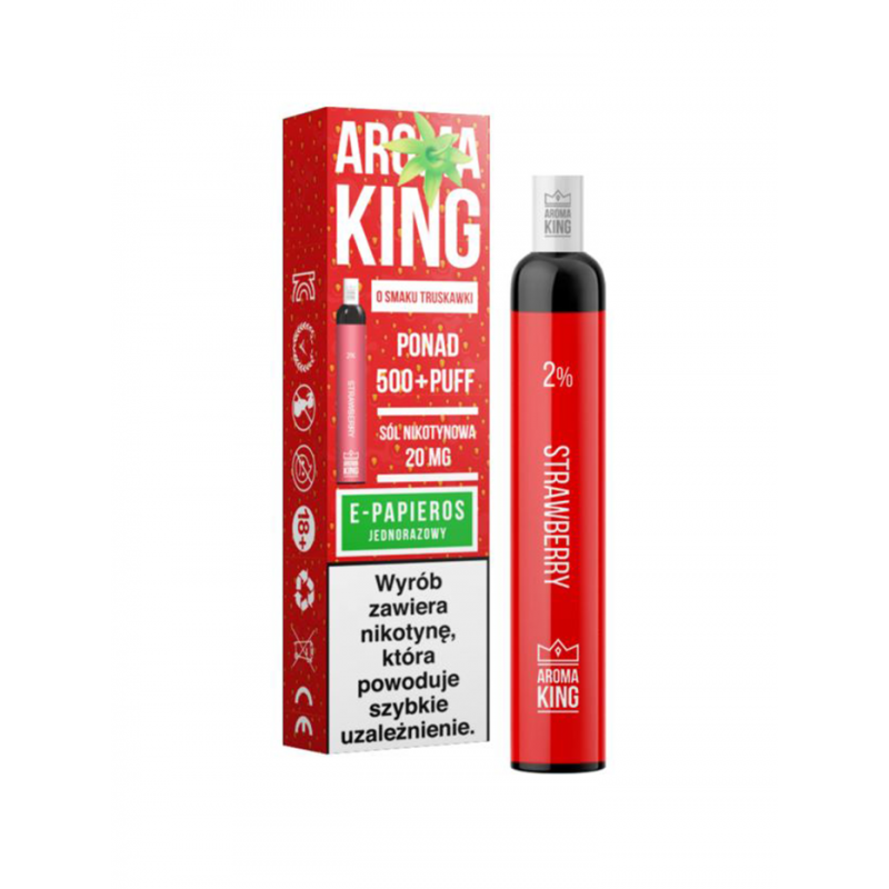 Jednorazowy e-papieros napełniony liquidem w postaci soli nikotynowej o smaku truskawki. Moc: 20mg/ml. Ilość zaciągnięć: 500.